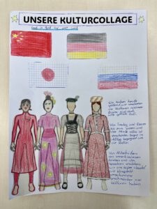 Nach der Stationsarbeit gestalteten die Gruppen eigene „Kulturcollagen“. Ihre Zeichnungen, Wörter, Symbole und persönliche Erfahrungen fanden darauf Platz – ein farbenfroher Ausdruck individueller und gemeinsamer kultureller Identitäten.